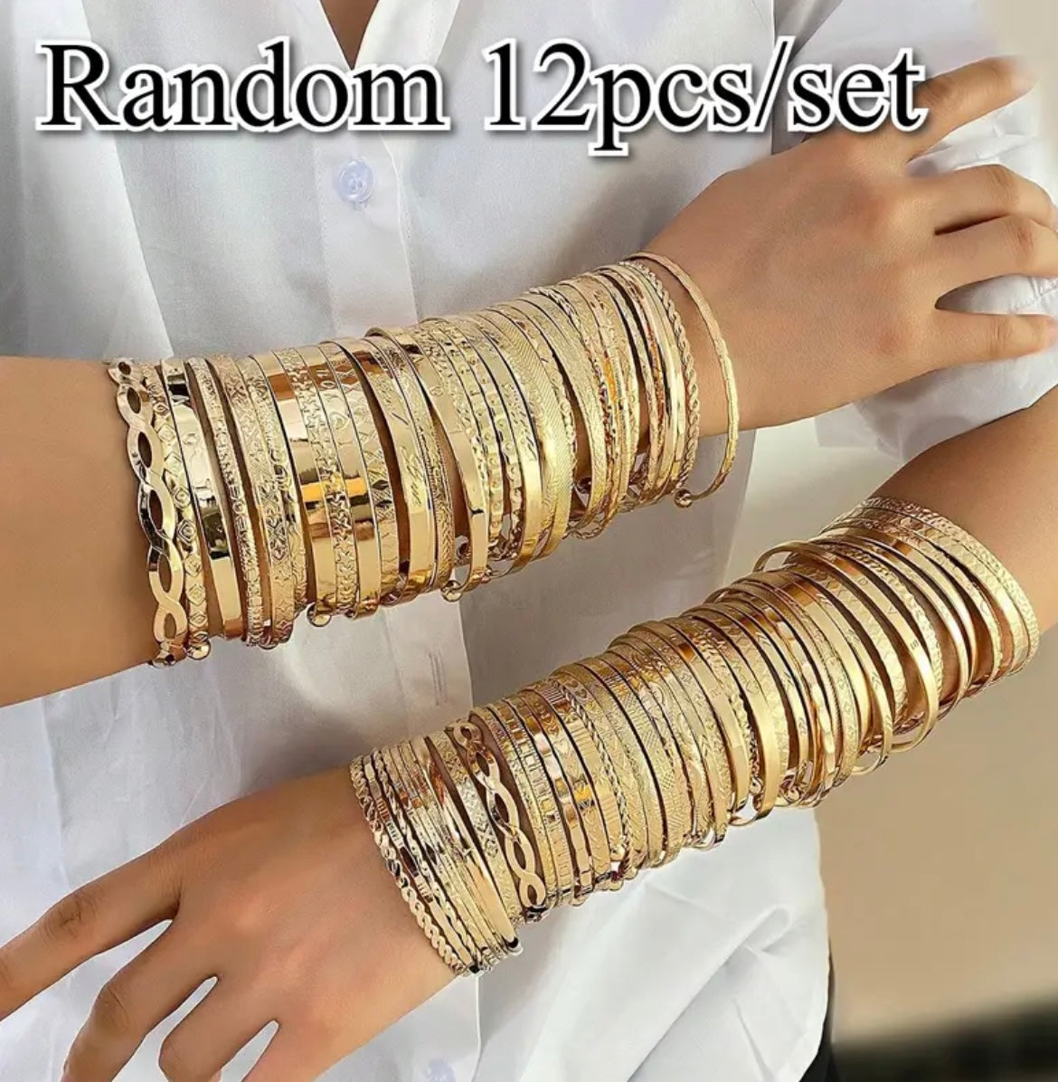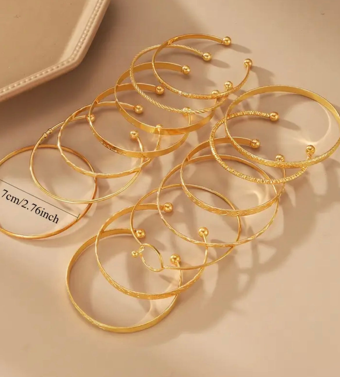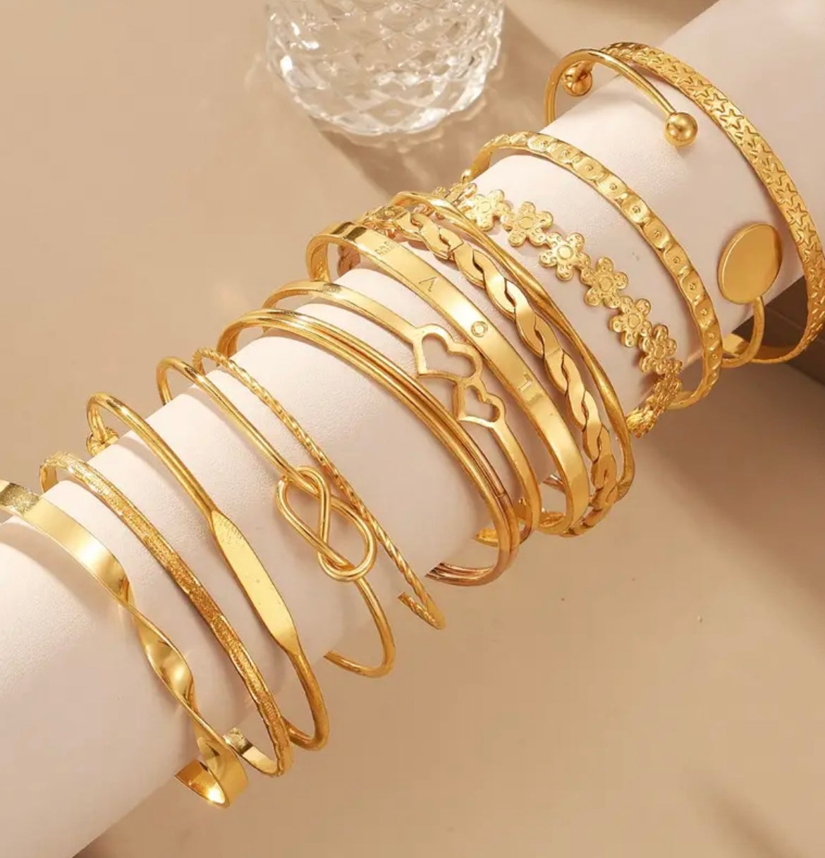 12pcs Set Women's Golden Bracelet Collection - Elegant Golden-Toned Stackable Bracelets with Heart, Link & Bead Charms, Luxurious Everyday Jewelry Gift Set for Christmas, Birthdays, Valentine's Day - Durable Tarnish-Resistant Metal-Like Material