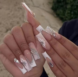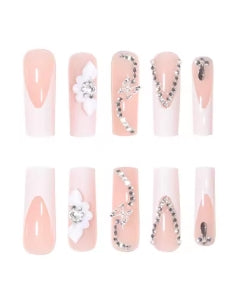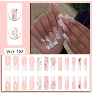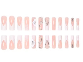 24 Pcs Long French Flower Drill Chain Nails with File Strip 1 and Jelly Glue 1