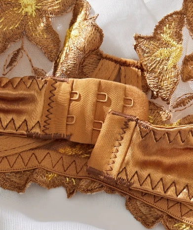 Bronze Flower Embroidered Women'S Lingerie Set, Semi-Sheer Underwire Bra And Satin