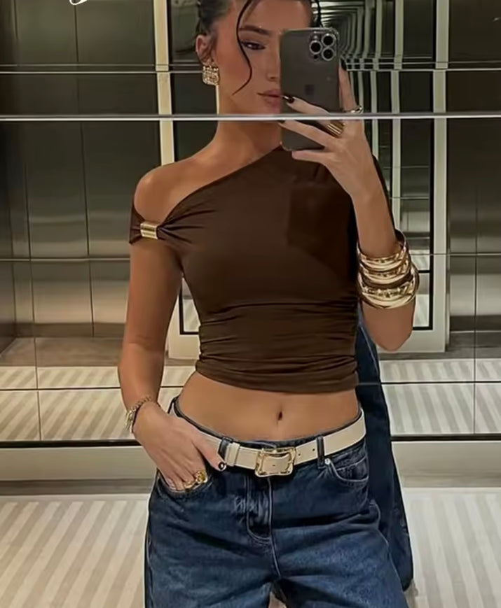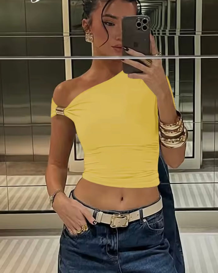 Dulzura Skew Collar Short Sleeves Ruched Metal T-Shirt Women'S Solid Casual Elegant Y2K Tops