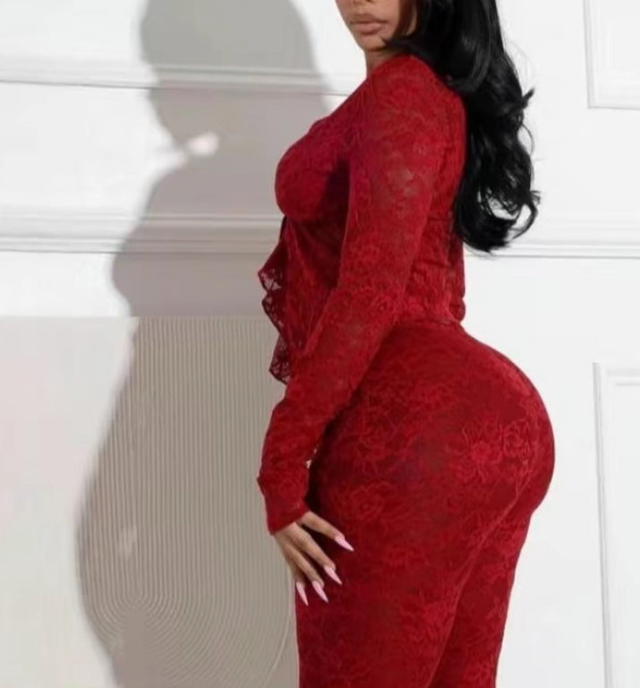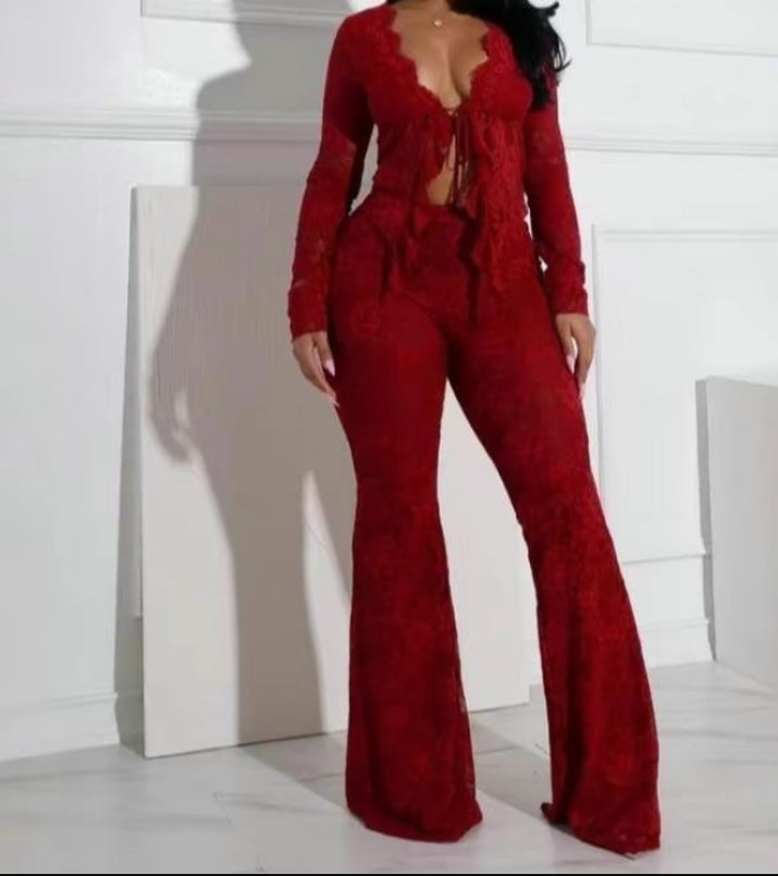 Sexy lace up hollow cardigan long sleeve shirt lace pants two piece set women