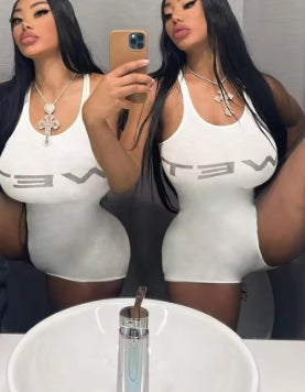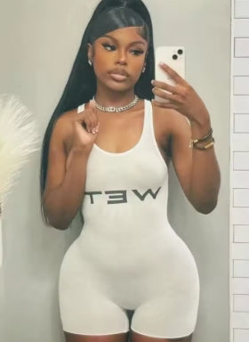 Strange cat letter print romper for women, casual sleeveless sporty fitted jumpsuit with low neck and elastic activity, tight short jumpsuits
