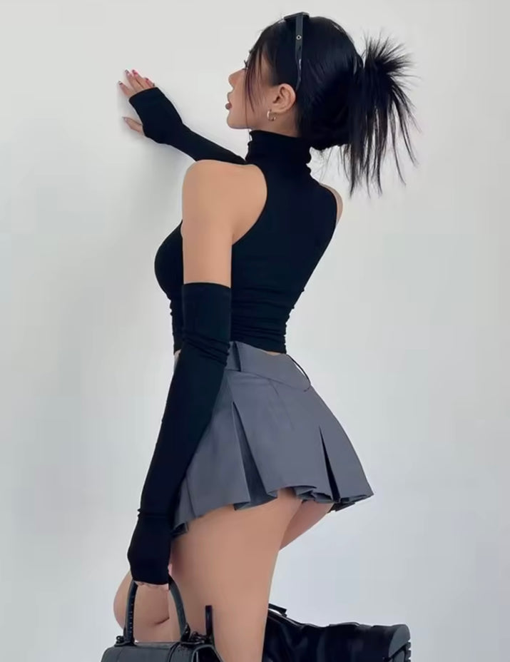 Summer Top Sexy Tank Top Spicy Girl Sleeves High Neck Pleated Club Crop Top Women tshirt