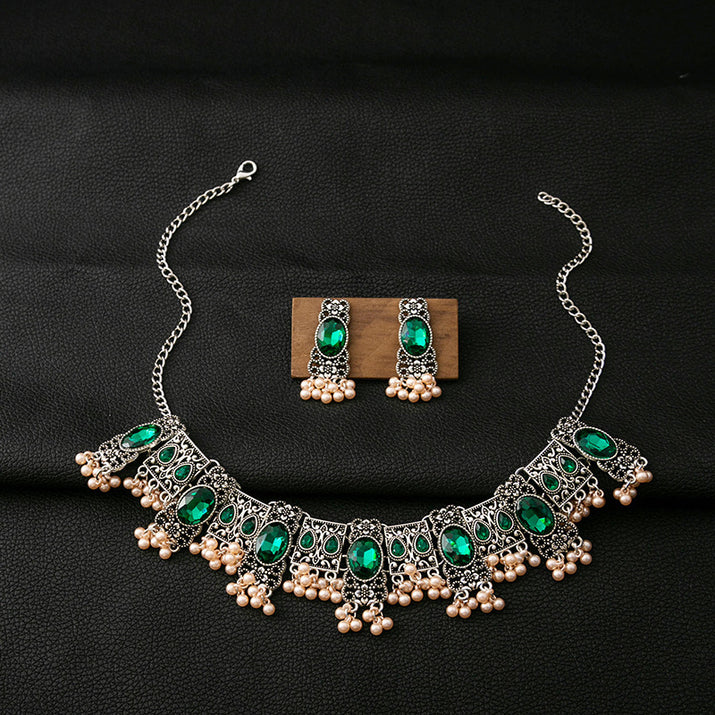 Vintage Emerald Earrings Ethnic Style Square Tassel Bead Pendant Jewelry Suit