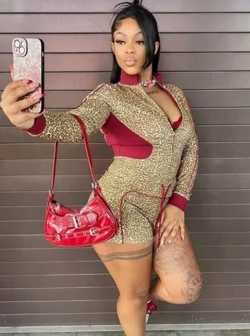 Weird Puss Casual Women 2 Piece Set Tracksuit Leopard Print Patchwork Zip Crop Jacket+Shorts Sporty Stretch Streetwear Outfits