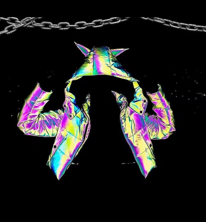 Winter Women Rainbow Reflective Horn Hooded Parkas Down Bubble Coat Puffer Jacket